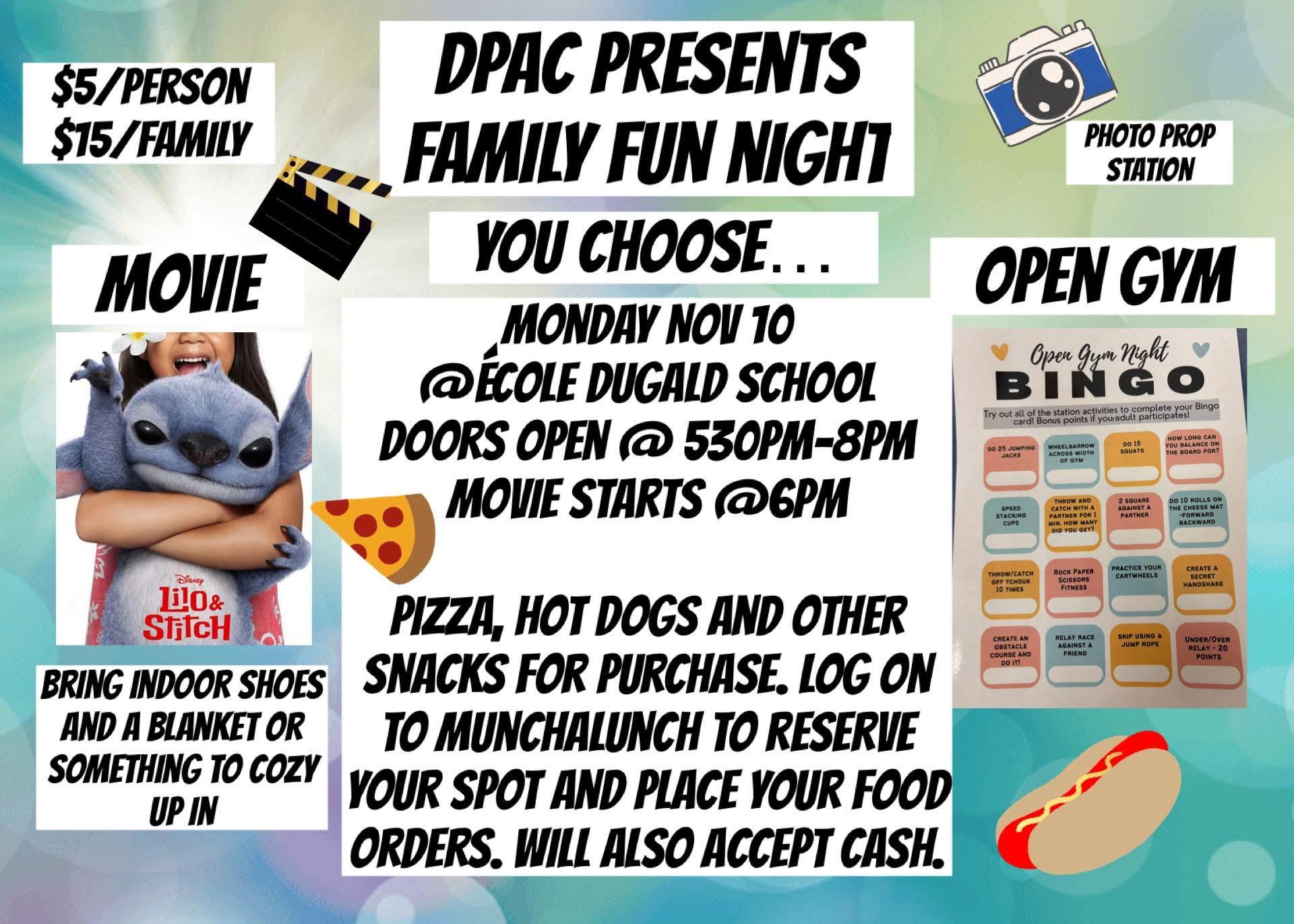 DPAC Family Fun Night Monday, November 10th. Doors open @ 5:30pm, Movie starts @ 6pm. See poster for more details!